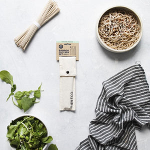 - Set includes bamboo knife, fork, spoon and chopstick set in a handy travel pouch