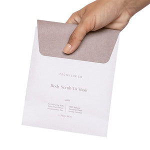 Peggy Sue's Body Scrub To Mask comes in a compostable cello bag blended in Australia from 100% natural ingredients. So go forth and enjoy some self-care and deeply nourish your skin.