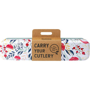 - Stainless steel tin with cutlery housed in a fabric pouch for storage and transport.