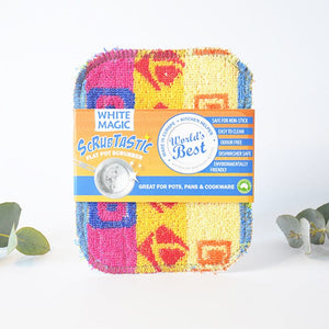 This Scrubtastic flat pot scrubber in great for cleaning your pots, pans and cookware. Made from 97% cotton and 3% non-toxic water based coating this cleaning cloth makes scrubbing a breeze. Safe on non-stick cookware, dishwasher safe and lasts 10 times longer than synthetic scourers. To clean and sanitise the White Magic Scrubtastic simply put in the dishwasher, washing machine or a pot of boiling water.