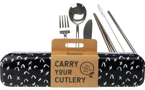 Choose to reuse with this cutlery set, your companion to zero waste take away or lunches. This kit featuring a sturdy metal carry case that contains full size cutlery, straw and chopsticks, all you need when you're out and about. Say goodbye to bendy single use cutlery for good, with this must have accessory for any eco warrior.
