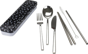 - Stainless steel tin with cutlery housed in a fabric pouch for storage and transport.
