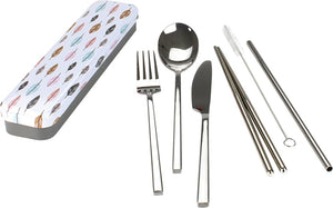 - Stainless steel tin with cutlery housed in a fabric pouch for storage and transport.