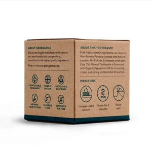 This natural mineral rich toothpaste formula packs a punch with a strong minty flavour. Studies have shown Peppermint Oil to be extremely effective at killing anaerobic bacteria, left untreated this bacteria can cause gum disease. The fluoride free and SLS free formulation is an ideal replacement to your conventional toothpaste. Free from Fluoride and Glycerine, this formula promotes remineralisation. PETA certified cruelty free and vegan, packaged within beautiful plastic free packaging which recyclable or compostable.
